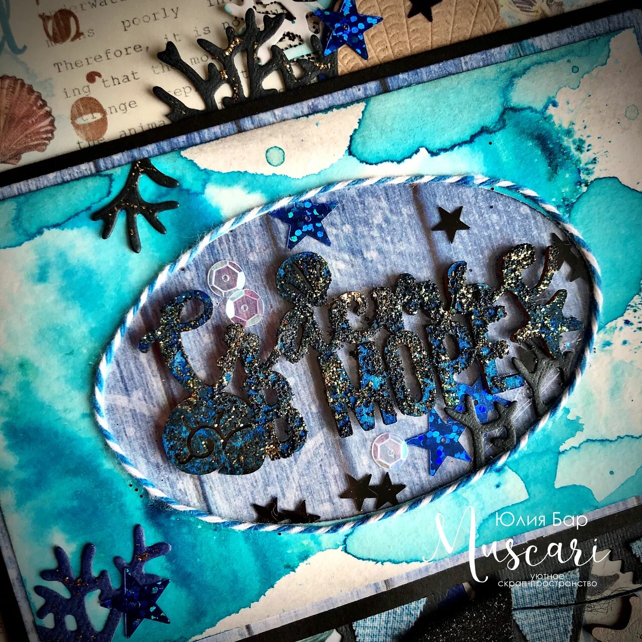 Не могу оставить без внимания корешок альбома, который специально для меня создала наша Ирочка Новоселова. Он тоже выполнен с применением коллекции Обними меня, Море от Muscari.